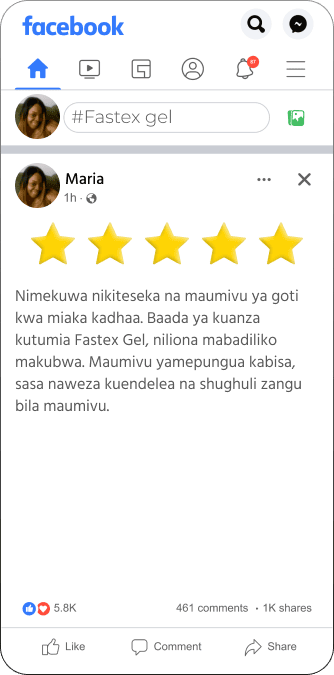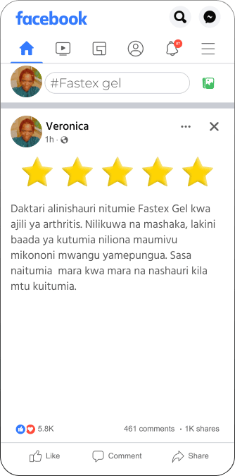 Fastex Gel ni suluhisho la asili linalosaidia kupunguza maumivu na kusaidia kuboresha uwezo wa kutembea kwa urahisi.